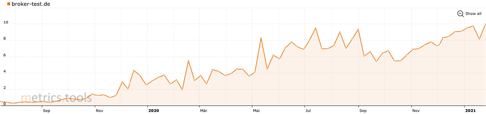 Soprattutto negli ultimi 18 mesi, Broker-Test.de è stato in grado di espandere continuamente la sua visibilità e la sua portata. Dove la visibilità è un valore relativo e un aumento di visibilità è sempre a spese dei concorrenti.